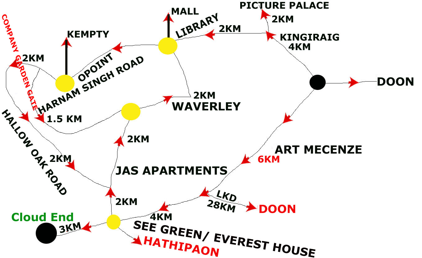 Dehradun to Cloud End via library Library mussoorie(7kms) left road pass shilton hotel-right Uturn after sun and snow hotel-left Uturn opposite CJM gate(6kms)- PWD road to hathipaon passed sea green cafe(3kms)-up hill municiple cemented road to cloud end(0kms).